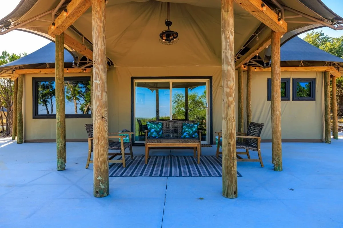 Four luxury tents that elevate glamping to new heights, each featuring full bathrooms, mini-kitchens, and premium furnishings for the ultimate hill country experience.
